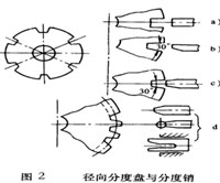 在圖2中,圖a是矩形槽盤;盤b、c是斜面槽盤;圖d是用齒形槽盤及其各種分度銷結(jié)構(gòu)。