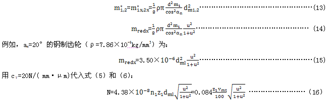 對圓柱齒輪,采用co′=14N/( mm·μm)。對圓柱斜齒輪的研究表明,螺旋 角增加時(shí),齒的剛度降低。另一方面,錐齒輪的輪齒在錐體上的螺旋形布置加強(qiáng)了斜齒、弧齒錐齒輪的剛度。由于缺乏更深入的了解,在平均條件下(FmtKA/bc≥100N/mm,與bc/b≥0.85),圓柱直齒輪的剛度對錐齒輪是適用的。因此,c′能按下式確定:
