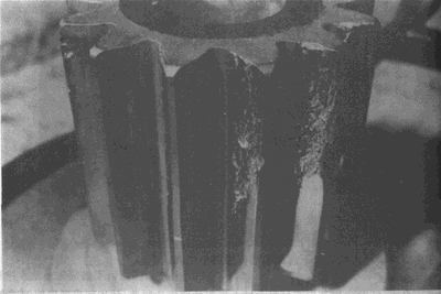 氮化小齒輪幾個輪齒上最大負(fù)載區(qū)域的剝落。