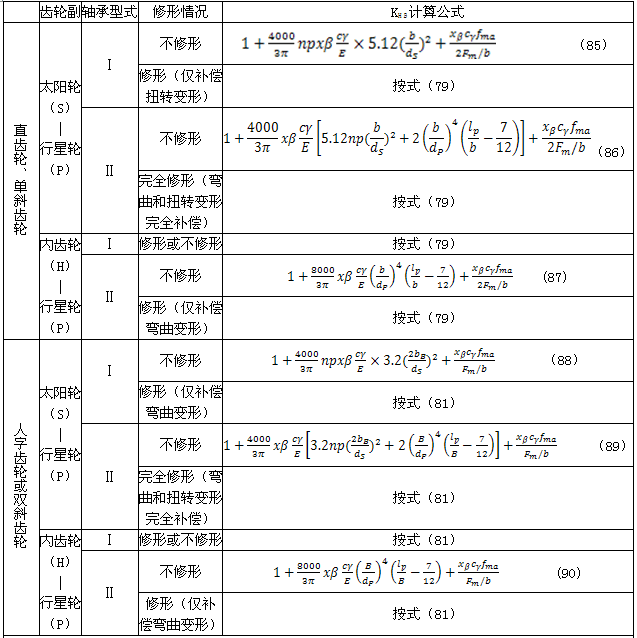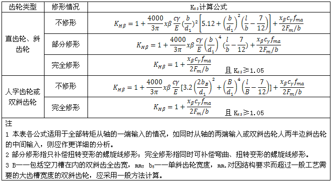 KHβ計算的一般方法適用條件列于6.3.2.1,計算公式按6.3.2.2。對于符合6.3.2.7中條件的一些典型結構齒輪裝置,如單對齒輪、軋機齒、簡單行星齒輪,其可KHβ按6.3.2.7所列公式計算。