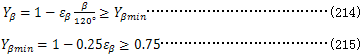 螺旋角系數(shù)Yβ是考慮螺旋角造成的接觸線傾斜對齒根應(yīng)力產(chǎn)生影響的系數(shù)。其數(shù)值可由式(214)和(215)計算。