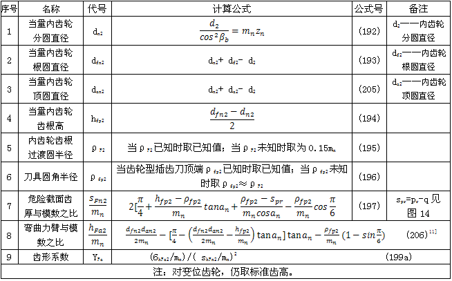 內(nèi)齒輪的齒形系數(shù)YF不僅與齒數(shù)和變位系數(shù)有關(guān),且與插齒刀的參數(shù)有關(guān)。為了簡化計算,可近似地按替代齒條計算(見圖15)。替代齒條的法向齒廓與基本齒條相似,齒高與內(nèi)齒輪相同,法向載荷作用角aFen等于an,并以腳標(biāo)2表示內(nèi)齒輪,有關(guān)計算公式見表20(適用于z2>70)。