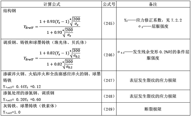 靜強度的YδrelT值可按表31中的相應公式計算得出(當應力修正系數(shù)在1.5<YS<3的范圍內(nèi)時,靜強度的相對敏感系數(shù)YδrelT近似地可取為:YS/YST;但此近似數(shù)不能用于氮化的調(diào)質(zhì)鋼與灰鑄鐵)。
