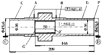 以軸套內(nèi)花鍵大徑為基準(zhǔn),用花鍵錐度芯軸大徑定位測(cè)量A、B、C、D各段外圓徑向跳動(dòng),用裝夾兩次的測(cè)量結(jié)果來(lái)判定軸套各段外圓徑向跳動(dòng)是否合格,規(guī)定一次裝夾和二次裝夾的測(cè)量結(jié)果都不允許超差。