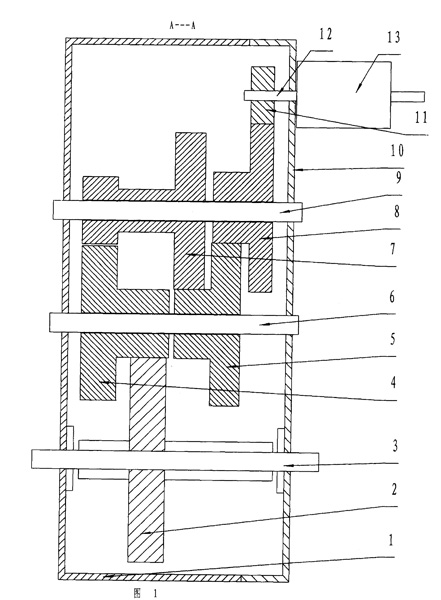 | 一種雙軸四減速減速機,包括外殼體、外殼蓋、輸入軸、輸出軸、齒輪,其特征在于:外殼體上裝有平行的一軸、二軸、動力輸出軸,一軸上裝有一軸齒輪組甲和一軸齒輪組乙、兩組中至少有一組可以繞軸自由轉(zhuǎn)動,二軸上裝有二軸齒輪組甲和二軸齒輪組乙、兩組中至少有一組可以繞軸自由轉(zhuǎn)動,動力輸出軸上固定著輸出軸齒輪,外殼蓋上固定著輸入軸軸承座,輸入軸上固定著輸入軸齒輪,各齒輪組分別由大直徑齒數(shù)多的齒輪和小直徑齒數(shù)少的齒輪組成,輸入軸齒輪與一軸齒輪組甲的大直徑齒輪嚙合,一軸齒輪組甲的小直徑齒輪與二軸齒輪組甲的大直徑齒輪嚙合,二軸齒輪組甲的小直徑齒輪與一軸齒輪組乙的大直徑齒輪嚙合,一軸齒輪組乙的小直徑齒輪與二軸齒輪組乙的大直徑齒輪嚙合,二軸齒輪組乙的小直徑齒輪與輸出軸齒輪嚙合。 |