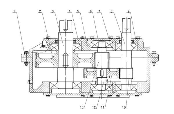 | 齒輪減速機,包括箱體和活動支撐在箱體上的主傳動軸、中間傳動軸以及被動傳動軸,箱體通過螺栓固定連接端蓋,主傳動軸上安裝一主齒輪,中間傳動軸上安裝一被齒輪和二主齒輪,被動傳動軸上安裝二被齒輪,一主齒輪與一被齒輪相嚙合,二主齒輪與二被齒輪相嚙合,其特征在于:一主齒輪(10)與一被齒輪(11)的模數為2,二主齒輪(13)與二被齒輪(2)為模數3.5的雙圓弧齒。 |