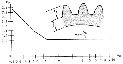 計(jì)算分析表明,當(dāng)齒輪的輪緣厚度SR相對(duì)地小于輪齒全齒高h(yuǎn)t時(shí)(SR及ht意義見C1),輪齒的齒根彎曲應(yīng)力將明顯增大。光彈實(shí)驗(yàn)和有限元分析均指出:當(dāng)輪緣齒高比mB=SR/ht≥2.0時(shí),mB對(duì)齒根彎曲應(yīng)力沒有影響。在mB=1.0~2.0區(qū)間,齒根彎曲應(yīng)力開始增大。圖C1是經(jīng)分析歸納得出輪緣系數(shù)YB與輪緣高比mB的關(guān)系曲線,它由以mB=1.0和1.56為折點(diǎn)的三段直線組成。