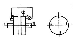 當(dāng)兩根轉(zhuǎn)軸有軸向竄動(dòng)時(shí),測(cè)量端面圓跳動(dòng)量首先必須在未聯(lián)成一體的兩半聯(lián)軸器外圈,沿軸向劃一直線做為零線后,再將要聯(lián)接的Ⅱ軸上的右半聯(lián)軸器外側(cè)表面從零線開始起,分為4等分,并標(biāo)出1、2、3、4的記號(hào),