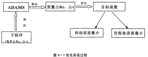 上已述及,擺線輪修形方式及修形量的選擇對RV減速器傳動誤差及空程角誤差的影響很大,因此進行優(yōu)化分析應(yīng)將傳動誤差及空程角誤差作為目標函數(shù),而將移距修形量△Rz及等距修形量△r作為設(shè)計變量,且△Rz與△r的正、負號表明了修形方式,子程序又是建立擺線輪的通用齒廓方程,通過ADAMS對子程序的調(diào)用,就可得到最優(yōu)的修形組合。具體的實現(xiàn)過程如下圖所示: