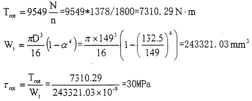 根據(jù)實(shí)際情況計(jì)算出工作時(shí)的剪應(yīng)力:GK2型內(nèi)燃機(jī)車啟動發(fā)電機(jī)ZQF-38TH,115V,38KW,1170~358Or/min;GK2型內(nèi)燃機(jī)機(jī)用柴油機(jī)型號為MTU16V396TC14,持續(xù)功率為1378KW,旋轉(zhuǎn)角速度為18O0rod/min。柴油機(jī)冷區(qū)液溫度為40℃時(shí)最小啟動轉(zhuǎn)矩包括加速余量約8OON.m,曲軸扭矩約75ON.m