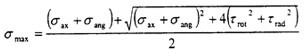 此時(shí)的應(yīng)力情況屬于三向應(yīng)力狀態(tài),所以其分析過程和徑向不對中900以及2700以情況相似,只是這里還有了附加的軸向拉應(yīng)力和附加的角向應(yīng)力,將各個(gè)應(yīng)力值σxx=σax+σang,σyy=0,σzz=0,τxy=τrot,τyz=0,τzx=τrad分別代入式(4-29)(4-30)(4-31)中,可以得到