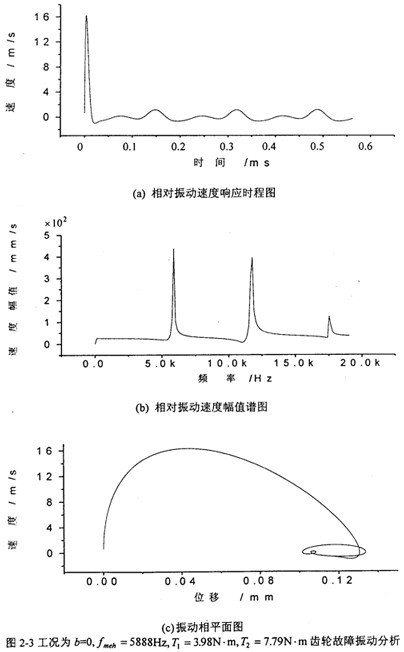 圖2-3是工況為:齒輪嚙合頻率為5888Hz、齒側(cè)間隙b=0齒輪故障振動(dòng)分析,其中(a)圖為齒輪輪齒相對(duì)振動(dòng)速度時(shí)程響應(yīng)圖,(b)圖為齒輪輪齒相對(duì)振動(dòng)速度幅值譜圖。從圖上可看出,當(dāng)齒側(cè)間隙為0時(shí),此時(shí)振動(dòng)故障頻率為齒輪嚙合頻率fmeh。的1、2、3倍。相平面圖也穩(wěn)定于一個(gè)橢園極限環(huán)(見(jiàn)(c)圖)。