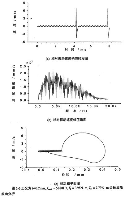 軸承對(duì)箱體動(dòng)態(tài)激勵(lì)力和齒傳輸線相對(duì)振動(dòng)位移X=(rb1tgθ1-rb2tgθ2)有相對(duì)振動(dòng)速度 (=rb1sec2θ1 1)有關(guān),文中只列出 的計(jì)算結(jié)果,圖2-3~圖2-13為各種工況的齒輪故障振動(dòng)分析,其中包括齒輪輪齒相對(duì)振動(dòng)速度時(shí)程響應(yīng)圖、齒輪輪齒相對(duì)振動(dòng)速度幅值譜圖和相平面圖。