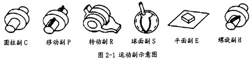 在等角速萬向聯(lián)軸器中,大部分都屬于連桿機構.最古老的雙聯(lián)十字軸萬向聯(lián)軸器機構就是球面四連桿機構。從大量的不同的機構綜合中,有可能得出多種實用的等角速連桿機構,所以研究等角速理論,以連桿機構的型式和尺度關系為對象,進行新的等角速理論的探索,在一定的意義上是可行的。在機構學上,構件同構件間的連接稱為副,其不同的形式和代號如圖2-1所示: