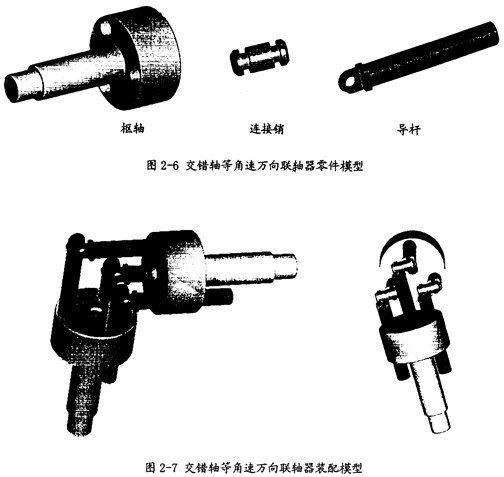 交錯軸等角速萬向聯(lián)軸器的裝配模型和零部件模型分別如圖2-7、圖2-6所示,這一種聯(lián)軸器目前還停留在研究階段。它的所有運動副都為低副,制造工藝簡單,能實現(xiàn)交錯軸的等角速傳動。它最大的特點是可以在交錯情況下,進行90度夾角的運動(構件不干涉的情況下)。
