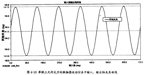 由圖4-10可以知道,輸入軸同輸出軸的夾角在三叉桿式萬向聯(lián)軸器運(yùn)轉(zhuǎn)時(shí)是不斷變化的,在每一個(gè)回轉(zhuǎn)周期中,它的變化頻率為3次,這證明了這種聯(lián)軸器是一種非定心式萬向聯(lián)軸器,同時(shí)在一定的程度上驗(yàn)證了三叉桿式三軸頸的交點(diǎn)以三倍于萬向聯(lián)軸器的轉(zhuǎn)速作圓周運(yùn)動的理論的正確性。另外還可看出盡管夾角在不斷變化,但變化非常小,對兩軸的夾角大小影響很小,本次仿真中夾角大小平均是164.32°(其補(bǔ)角為15.7°,即是第三章中理論計(jì)算中的角度之一)。