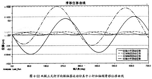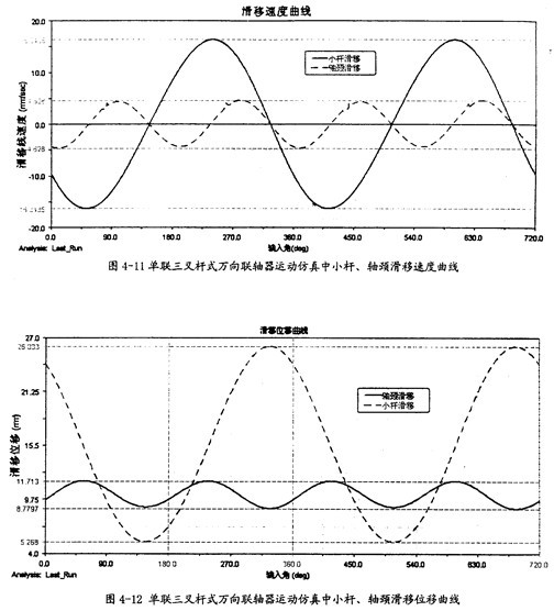 由圖4-12可以知道,在一定的夾角下,小桿在滑道中的滑移位移同小桿球面中心相對軸頸的滑移位移是不同的,前者(20.76mm)要遠(yuǎn)大于后者(2.93mm),且它們變動的頻率也不一樣,在一個(gè)回轉(zhuǎn)周期中,前者步率是1次,而后者2次。此圖中的兩曲線同第三章中的理論分析曲線圖3-9、圖3-10是吻合的。這在一定的程度上也證明了三叉桿式萬向聯(lián)軸器理論分析中對小桿滑移位移和軸頸滑移位移這兩項(xiàng)計(jì)算的正確性。