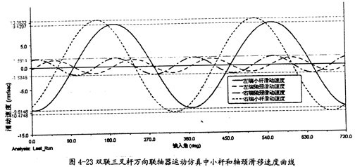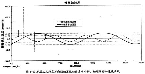 由圖4-11可以知道,在一定的夾角下,小桿在滑道中的滑移速度同小桿球面中心相對軸頸的滑移速度是不同的,前者要遠(yuǎn)大于后者,且它們變動的頻率也不一樣,在一個(gè)回轉(zhuǎn)周期中,前者頻率是1次,而后者是2次。此圖中的兩曲線同第三章中的理論分析曲線圖3-11、圖3-12是吻合的,只是小桿滑移的速度曲線在外形上有一點(diǎn)差異,仿真的曲線相當(dāng)?shù)钠交、?guī)則,但理論分析曲線卻不規(guī)則,這可能是在計(jì)算中簡化和省略的原因。盡管如此,這也證明了三叉桿式萬向聯(lián)軸器理論分析中對小桿滑移速度和軸頸滑移速度這兩項(xiàng)計(jì)算的正確性。