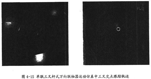 由圖4-15可以看出,在單聯(lián)三叉桿式萬向聯(lián)軸器的運(yùn)動仿真中,三叉交點(diǎn)運(yùn)動軌跡是一個(gè)圓,相對于半徑值R(此值的意義見第三章)它的半徑是相當(dāng)小的,這也解釋了為何運(yùn)動中兩軸夾角在不斷作微小的變化,同時(shí)也證明了軸頭中心軌跡理論的正確性。