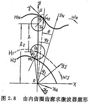 由上面可以看出,在選定激波器廓形TJ=TJ(θ)的情況下,正反兩種結(jié)構(gòu)所得到的內(nèi)齒圈齒廓方程式(2.21)與式(2.22)在形式上是不同的。對于反向結(jié)構(gòu),用-θ代換激波器方程中的θ,即令TJ=TJ(-θ),則θ增加的方向為順時針方向,若激波器廓形可表示為偶函數(shù),即TJ(一θ)=TJ(θ),讓激波器按逆時針方向轉(zhuǎn)動,則所得的內(nèi)齒圈齒廓方程式完全與(2.21)式相同。因而齒廓方程式(2.22)與式(2.21)雖然形式不同,但實質(zhì)是一樣的。區(qū)別在于參數(shù)吸的取值方向,今后以式(2.21)作為內(nèi)齒圈齒廓的標準形式。