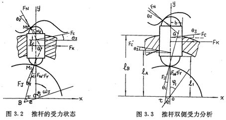 當(dāng)FJ、FN二力的交點(diǎn)Q落在傳動(dòng)圈所在環(huán)內(nèi)(圖3.2所示),推桿呈現(xiàn)單側(cè)受力狀態(tài)(右側(cè)受力),對(duì)推桿質(zhì)心取矩,可得如下平衡方程式: