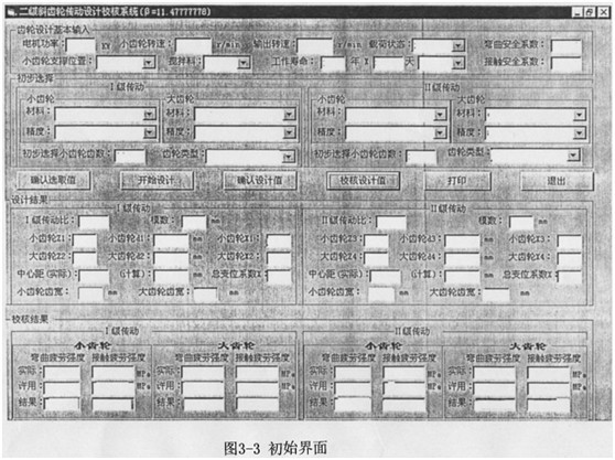 c、輪齒疲勞強(qiáng)度及其修正系數(shù)(ZNT、YNT、ZL、Zv、ZR、Zx、Yx、Yδreit、YRreIT)在這三類參數(shù)中,用戶參數(shù)是要由用戶給定,齒輪特性參數(shù)是要得到的結(jié)果,齒輪設(shè)計(jì)參數(shù)是一種中間描述參數(shù),它需要通過一系列的復(fù)雜的計(jì)算求解,而齒輪設(shè)計(jì)的科學(xué)性也就是通過對(duì)齒輪設(shè)計(jì)參數(shù)的精確確定而實(shí)現(xiàn)的,具體計(jì)算機(jī)實(shí)現(xiàn)公式見3.6-3.8;齒輪的接觸強(qiáng)度與彎曲強(qiáng)度校核分別見3.3和3.4。系統(tǒng)的參數(shù)初始輸入界面見圖3-3。