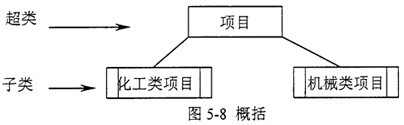 3、概括(Generalization):定義類型之間的一種子集聯(lián)系。它抽象了類型之間的“is ubset of”的語(yǔ)義。例如項(xiàng)目是個(gè)實(shí)體型,機(jī)械類項(xiàng)目也是實(shí)體型,化工類項(xiàng)目也是實(shí)體型。機(jī)械類項(xiàng)目、化工類項(xiàng)目均是項(xiàng)目的子集。我們把項(xiàng)目稱為超類(Superclass),將機(jī)械類項(xiàng)目、化工類項(xiàng)目成為項(xiàng)目的子類(Subclass),見圖5-8。