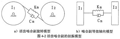 根據(jù)各種零件動力學(xué)作用的不同,可把組成系統(tǒng)的各元件分成兩類,即慣性元件和彈性元件。慣性元件指的是各軸及軸上的旋轉(zhuǎn)質(zhì)量,如齒輪、軸上直徑較大的凸緣等盤類零件。當(dāng)傳動系統(tǒng)發(fā)生扭轉(zhuǎn)振動時,它們對系統(tǒng)的動力學(xué)作用,主要反映在轉(zhuǎn)動慣量方面,所以稱之為慣性元件。彈性元件是指兩慣性元件之間的軸段,它可以不計質(zhì)量而只考慮扭轉(zhuǎn)變形,它對振動系統(tǒng)的作用在于本身的扭轉(zhuǎn)剛度。