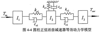 根據(jù)上面敘述的方法,可以建立起如圖4-3所示的動力學(xué)模型。為便于分析,將圓柱正弦活齒傳動系統(tǒng)的動力學(xué)模型簡化,由于在一個工作周期中,各活齒在扭振方向的工作狀態(tài)完全相同,故可將所有的活齒等效為一個慣性元件,并根據(jù)熱能不變的原則,將各活齒副的嚙合剛度轉(zhuǎn)化為等效的扭轉(zhuǎn)剛度,然后疊加得出整體的等效扭轉(zhuǎn)剛度。由此,各活齒與主動軸、導(dǎo)架及殼體間并聯(lián)的彈性連接和阻尼分別等效為一個彈性軸段。等效簡化后的動力學(xué)模型如圖4-4所示。