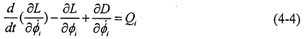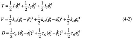 對轉(zhuǎn)換成鏈狀結(jié)構(gòu)的系統(tǒng),應(yīng)用拉格朗日法建立系統(tǒng)的扭振動力學(xué)方程,系統(tǒng)中帶有粘性阻尼,因此列出含有耗散函數(shù)的拉格朗日方程