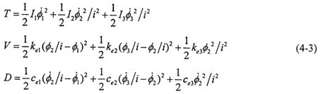 分別為轉(zhuǎn)換前后各慣性元件的扭轉(zhuǎn)角,按傳動比關(guān)系有: