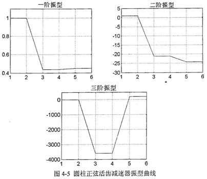 根據(jù)式(4-9)、(4-10)及(4-12)計算出固有頻率、勢能分布率和模態(tài)柔度見表4-2。利用Matlab編制程序還繪制出圖4-5所示的減速器系統(tǒng)的振型曲線。