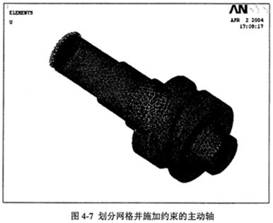 四面體單元每個節(jié)點有三個自由度(Tx,Ty,Tz),通過限制節(jié)點的自由度,對模型施加約束。模擬軸承的作用,在安裝軸承處的零件表面施加約束,首先將表面上所有節(jié)點的坐標(biāo)由笛卡爾坐標(biāo)(x,y,z)轉(zhuǎn)換為柱坐標(biāo)(R,θ,Z),然后限制自由度R。并在主動軸的輸入軸端面和導(dǎo)架的輸出軸端面,限制所有節(jié)點的自由度。劃分網(wǎng)格并施加約束的主動軸見圖4-7。