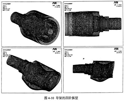 選擇Subspace特征值求解器,指定擴展模態(tài)數(shù)為4,頻率范圍為0~1000Hz。求得輸入軸的前四階固有頻率為101.SHz、207.2Hz、660.6Hz、661.2Hz,對應(yīng)的振型見圖4-8。一階振型為繞z軸扭轉(zhuǎn),二階振型為沿z軸軸向拉伸,三階振型為在xoz平面彎曲,四階振型為在yoz平面彎曲。