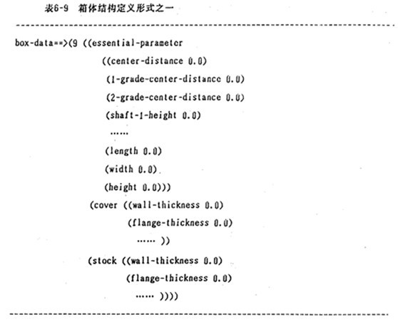 在進(jìn)行圖1-1、圖1-2-1、l-2-2、1-2-3種類的圓柱齒輪減速器設(shè)計(jì)時,箱體是種類最多,變化程度最大的部件,因此,不可能建立一種統(tǒng)一的模式。根據(jù)傳動方案的不同,箱體形狀會發(fā)生很大的變化,設(shè)計(jì)工作量極繁重。通過分析,本系統(tǒng)采用的方法是通過框架來表達(dá)箱體設(shè)計(jì)的大量知識,如表6-11所示的框架是圖1-2-2 中第9號箱體的結(jié)構(gòu)定義式。