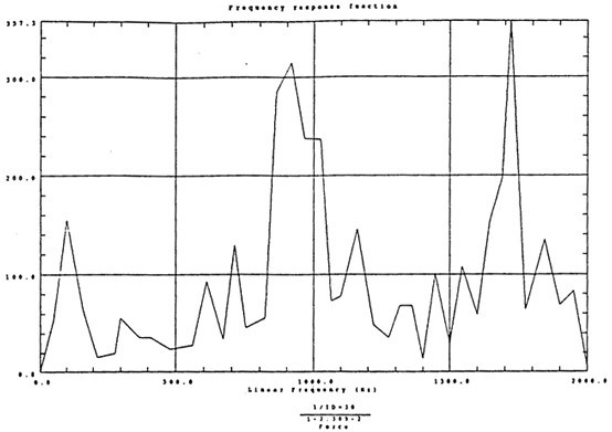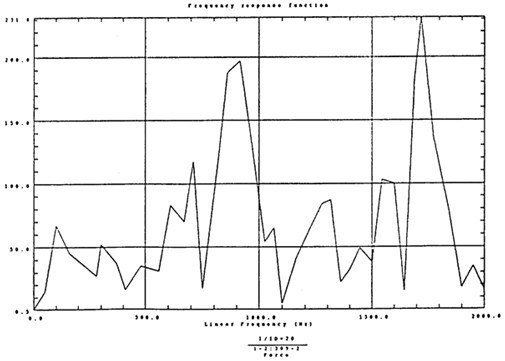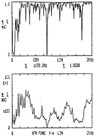 有了脈沖激勵(lì)信號(hào)和脈沖響應(yīng)信號(hào)后,CF-355頻譜分析儀就能計(jì)算出測(cè)點(diǎn)12X向由于14點(diǎn)X向激勵(lì)間的頻響函數(shù)H(ω)及其相干函數(shù),如圖4-5所示。圖4-6是頻響函數(shù)H(ω)的倒數(shù)。