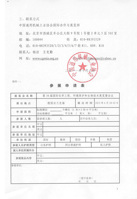 參展方式:預(yù)參展會員企業(yè)于2011年10月31日前向各專業(yè)分會報名并說明參展面積;總會統(tǒng)計參展商人數(shù)及參展面積后,向阿赫瑪展會主辦方申請參展總面積,待主辦方確認(rèn)面積及價格后,向各參展商通報最終展位價格并與之共同協(xié)商展位分布。《參展申請表》見附件一。