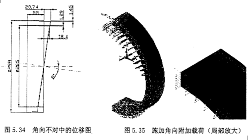 重復(fù)5.4.2節(jié)中的(1),(2),(3),(4),(5),(6)步驟。然后開始施加由于徑向的位移產(chǎn)生的附加剪應(yīng)力。角向不對(duì)中時(shí),由于兩軸之間存在一定的夾角,使得橡膠圓環(huán)最上方受到附加的拉應(yīng)力,而圓環(huán)的最下端則受到附加的壓應(yīng)力,這個(gè)附加的拉應(yīng)力σang的大小和方問隨著圓環(huán)的旋轉(zhuǎn)角度改變而改變,在最上方時(shí)受拉,且絕對(duì)值最大,在最下方受壓,絕對(duì)值亦最大。而在平衡位置時(shí)則變成O。施加角向附加載荷后的圖形如5.35所示。