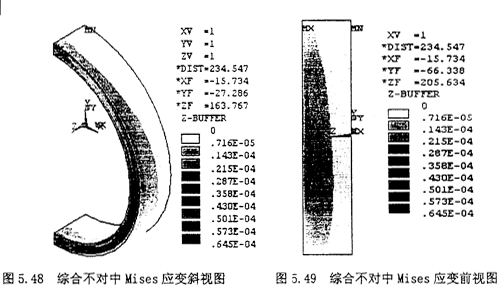 3.顯示節(jié)點(diǎn)的Von Mises應(yīng)變?cè)茍D:選擇Main Menu>General Postproc>Plot Result>NodalSolu,在彈出的對(duì)話框內(nèi)選擇“Strain”,第二欄內(nèi)選擇“Von Mises Strain”,則其顯示的云圖如圖5.48,5.49所示