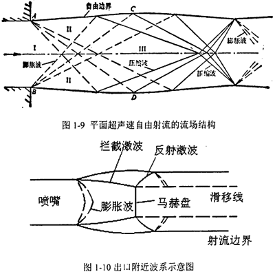 對(duì)于圖1-9所示的欠膨脹超聲速自由射流,當(dāng)射擊流從出口射入靜止大氣中的時(shí)候,由于出口截面上的射流的靜壓p1大于環(huán)境壓力pa,在裂尖的邊緣將發(fā)出兩族膨脹波,這兩族膨脹波在中心流線相交,氣體經(jīng)過膨脹波使靜壓由p1降到pa,經(jīng)膨脹波后氣流,其自由邊界向外擴(kuò)張。兩族膨脹波相交之后互相穿過,并保持為膨脹波。這些膨脹波在自由邊界反射回來形成兩族壓縮波,并使氣流邊界向內(nèi)收縮。這兩族壓縮波相互穿過并在自由邊界上反射回膨脹波,這種波的相交與反射現(xiàn)象不斷地進(jìn)行下去,逐漸衰減。