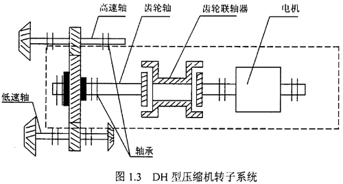 本課題來源于某工程應(yīng)用研究“雙軸型透平壓縮機(jī)軸承轉(zhuǎn)子系統(tǒng)動(dòng)力學(xué)分析”。圖1.3 是DH 型壓縮機(jī)轉(zhuǎn)子系統(tǒng)。在G 軸與電機(jī)軸之間采用齒輪聯(lián)軸器聯(lián)接。本文主要對(duì)圖1.3 虛線部分,G 軸、電機(jī)軸、齒輪聯(lián)軸器轉(zhuǎn)子系統(tǒng)進(jìn)行討論
