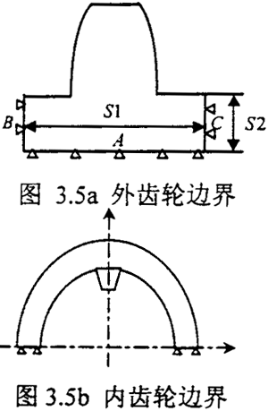 對(duì)于外齒輪Daimler-Benz公司選取邊界的方法是先取半個(gè)齒輪進(jìn)行有限無計(jì)算,這是從整體來考慮問題,然后根據(jù)計(jì)算的結(jié)果來選擇邊界的范圍,其所定的邊界寬度如圖3.5a,S1=6.1m,m是齒輪的模數(shù)。Chaber所取的邊界的方法是考慮圣維需原理,其所定的邊界深度為S2=1.5m。綜合以上兩者的研究,用有限無計(jì)算外齒的變形,計(jì)算模型的邊界范圍可。