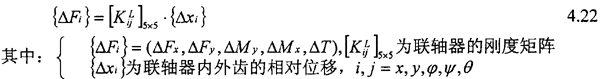 因此通過聯(lián)軸器的剛度[KijL]5×5(由第三章求得)把動態(tài)力和力矩表示成內外齒相對位移的顯函數(shù),從而得到齒輪聯(lián)軸器連接軸系的彎曲和扭轉振動方程。