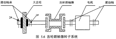 圖5.6是國產DH型透平壓縮機結構簡圖1-2中,齒輪軸(簡稱G軸)、電機、齒輪聯(lián)軸器、軸承組成的轉子系統(tǒng)。這是我們主要研究對象。