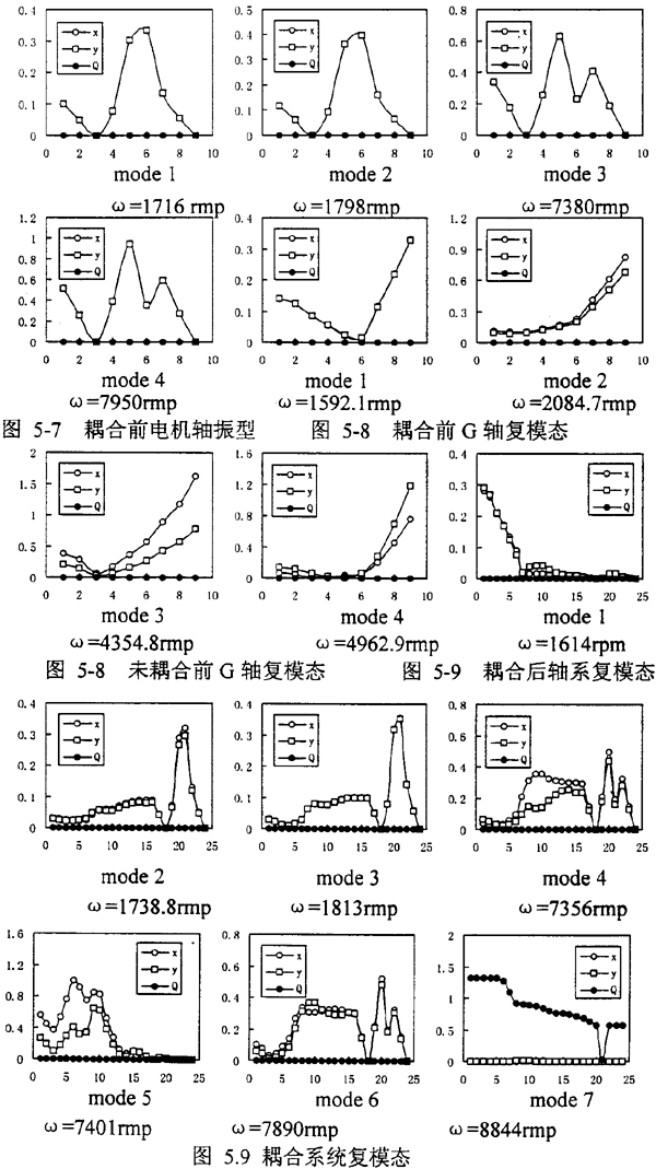 G軸和電機軸通過聯(lián)軸器聯(lián)接耦合后,軸系各軸承負荷分配發(fā)生變化,引起軸承工作狀態(tài)的改變,進而影響到整個軸系各跨轉子的穩(wěn)定性,從表5-12其中1#軸承負荷減少了60Kg,使用權得軸承的工作偏心減小,因此系統(tǒng)換轉速下降。