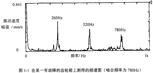 齒輪在傳動過程中,輪齒是不斷地處在一齒與兩齒交替咬合狀態(tài),對于斜齒輪,是不斷地處在兩齒與三齒交替咬合狀態(tài)。當齒側有間隙時,此時的振動體系是時變的非線性系統(tǒng);輪齒間隙過大時還會出現(xiàn)瞬時脫齒狀態(tài)。因此,齒輪所產(chǎn)生的振動除了和輪齒嚙合剛度時變性有關外,還和齒輪的制造誤差(如質量偏心、齒距偏差和齒形誤差)、裝配不良(如兩個齒輪軸心線不平行)、齒輪正常損傷(如齒輪正常磨損等)和齒輪非正常損傷(如齒面疲勞點蝕、齒面剝落、齒面燒傷、塑性變形和膠合撕傷等)有關。人們一般都認為,齒輪在振動時其振動故障頻率為齒輪嚙合頻率的n倍(n=l,2,3,…),但實際情況并不完全如此,如在圖1-1中,齒輪振動故障頻率為齒輪嚙合頻率的1/3、2/3和3/3倍,振動速度的幅值也較齒輪正常時大一些;在另外一些場合,齒輪振動故障頻率為n/m倍(n,m皆為正整數(shù))。因此很有必要對產(chǎn)生分數(shù)倍亞諧和超諧振動的原因作深入的研究工作。