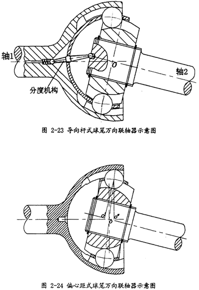 球籠式萬向聯(lián)軸器是目前性能最優(yōu)良,應(yīng)用最廣泛的一種等角速萬向聯(lián)軸器,根據(jù)結(jié)構(gòu)形式的不同可分為兩大類,即導(dǎo)向桿式球籠萬向聯(lián)軸器和偏心距式球籠萬向聯(lián)軸器,分別如圖2-23和圖2-24所示。
