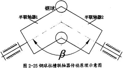 鋼球柱槽聯(lián)軸器同球籠式萬向聯(lián)軸器一樣,它也通過鋼球來傳遞兩個(gè)半聯(lián)軸器之間的力,當(dāng)兩個(gè)半聯(lián)軸器的軸線有相對(duì)的角位移時(shí),半聯(lián)軸器上的滾道能使鋼球分布在兩軸軸線相對(duì)角位移的等分角平面上(如圖2-25所示),從而保證兩軸同步。同球籠式萬向聯(lián)軸器不同的是它的鋼球分布在一個(gè)橢圓面上,而球籠式萬向聯(lián)軸器則分布在一個(gè)球面上。