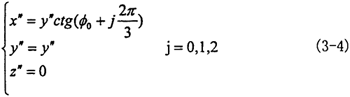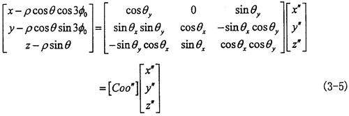 由于動坐標系O″X″Y″Z″的O″Y″軸取得始終垂直于固定坐標系OX軸,可認為先把OXYZ坐標系繞OX軸轉過夾角θx,使OY軸與O″Y″軸平行,再繞新的OY軸轉過θy,使OX軸與O″X″軸平行,OZ軸也同時平行于O″Z″軸(變換空間位置如圖3-6所示)。則固定坐標OXYZ與動坐標系間的變換關系如下: