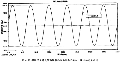 由圖4-10可以知道,輸入軸同輸出軸的夾角在三叉桿式萬(wàn)向聯(lián)軸器運(yùn)轉(zhuǎn)時(shí)是不斷變化的,在每一個(gè)回轉(zhuǎn)周期中,它的變化頻率為3次,這證明了這種聯(lián)軸器是一種非定心式萬(wàn)向聯(lián)軸器,同時(shí)在一定的程度上驗(yàn)證了三叉桿式三軸頸的交點(diǎn)以三倍于萬(wàn)向聯(lián)軸器的轉(zhuǎn)速作圓周運(yùn)動(dòng)的理論的正確性。另外還可看出盡管夾角在不斷變化,但變化非常小,對(duì)兩軸的夾角大小影響很小,本次仿真中夾角大小平均是164.32°(其補(bǔ)角為15.7°,即是第三章中理論計(jì)算中的角度之一)。